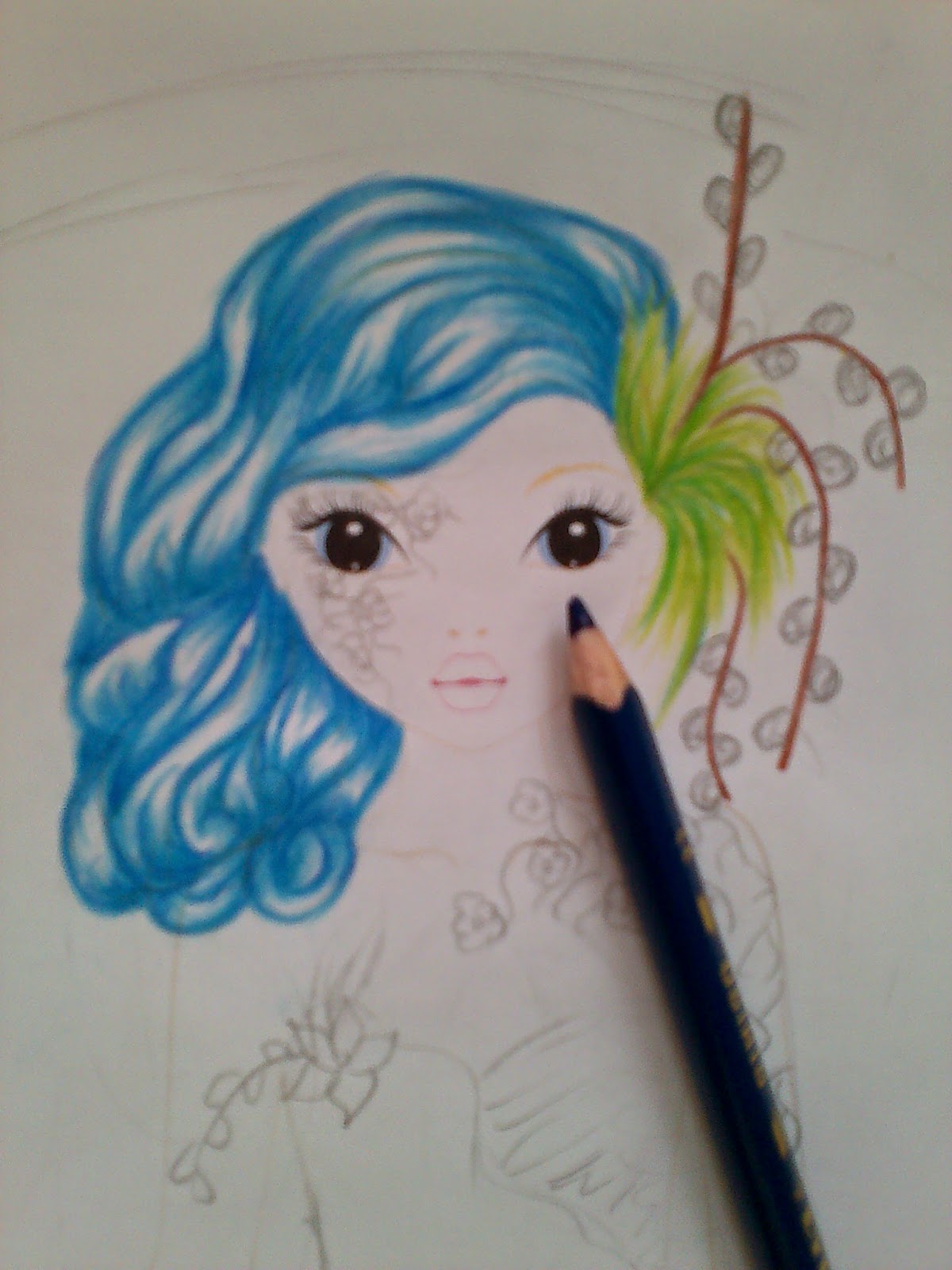 Tą samą kredką malujemy włosy robiąc pojedyncze pasma. Pamiętajcie o zostawieniu białego miejsca na refleksy świetlne!